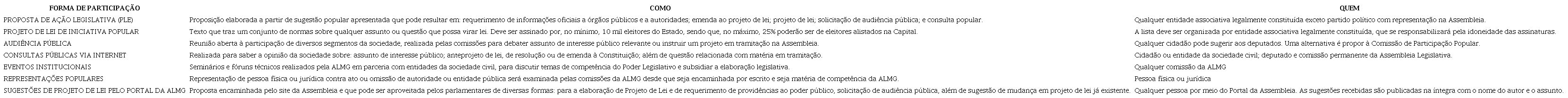 O Quadro 1 sintetiza as formas de participação cidadã existentes no âmbito da Assembleia Legislativa de Minas Gerais.