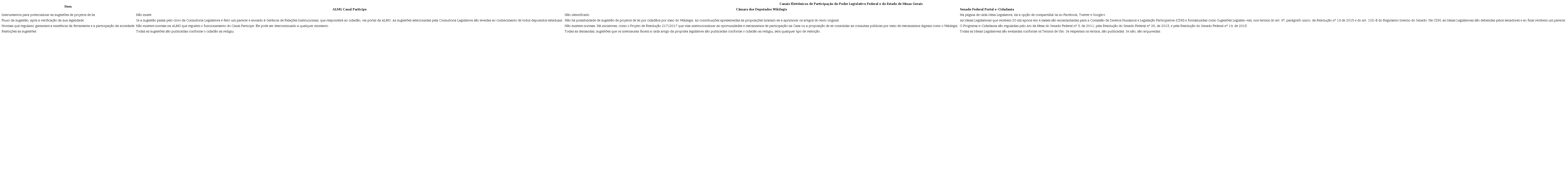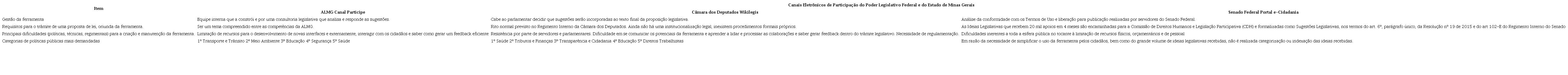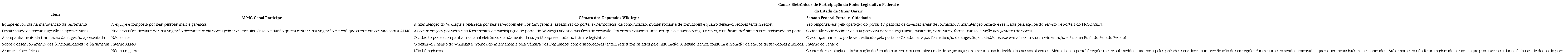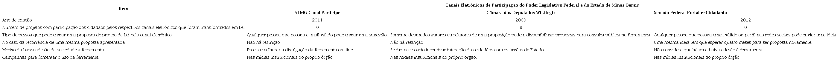 Na comparação entre os três canais de participação (Câmara dos Deputados Federais, Senado Federal e Assembleia Legislativa de Minas Gerais) pode-se constatar que a Câmara dos Deputados possui a ferramenta mais interativa e com mais recursos tecnológicos disponíveis, de forma que o cidadão pode editar diretamente a legislação em discussão, restando ao parlamentar, redator do projeto, acatar ou não a redação proposta pelo cidadão.