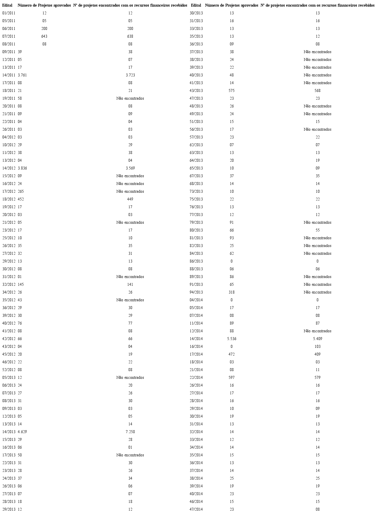 Foram elegíveis para esta pesquisa 16 editais de apoio ao pesquisador lançados pelo CNPq no ano de 2011. A estes editais foram submetidos 18.716 projetos de pesquisa, sendo aprovados 4.801 projetos e encontrados na listagem de recursos financeiros, 4.701 projetos. Em relação ao ano de 2012 foram analisados 31 editais, para os quais houve 17.449 submissões, 5.278 projetos aprovados e 4.656 projetos encontrados na lista do sistema Dados abertos. No ano de 2013 foram escolhidos 55 editais, sendo encaminhados 30.732 projetos de pesquisa, dos quais 6.852 foram aprovados, e na listagem de recursos encontramos 8.415 pesquisas que receberam financiamento que não fossem apenas na modalidade bolsa. Quanto ao ano de 2014 foram analisados 28 editais, que receberam 23.445 submissões com 7.096 aprovações, e encontrados na lista de recursos 6.888 projetos. Desse modo, esta pesquisa conta com dados sobre 130 editais lançados pelo CNPq entre 2011 e 2014 cujos pesquisadores receberam recursos financeiros que não fossem apenas bolsas (Quadro 1).