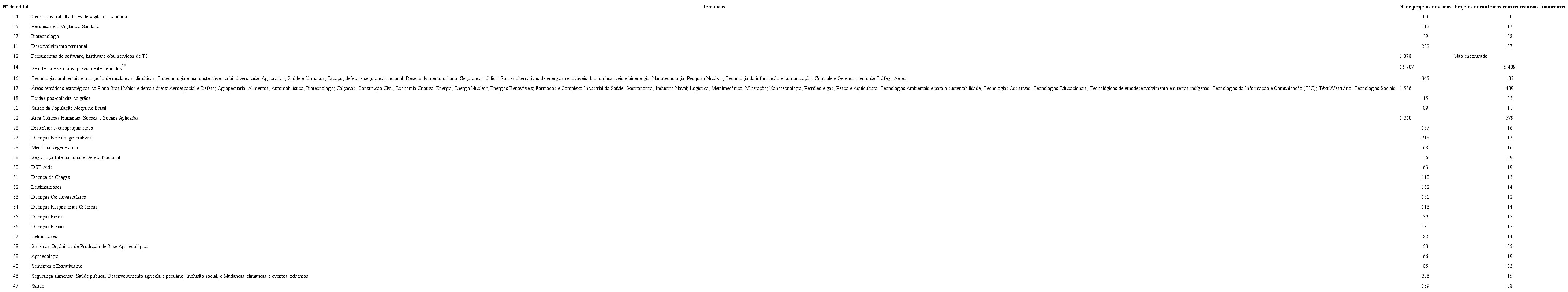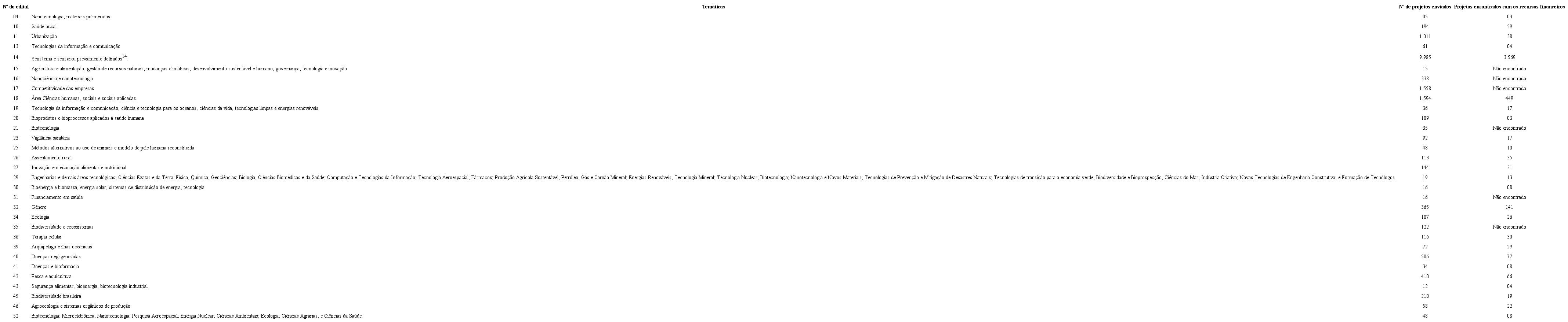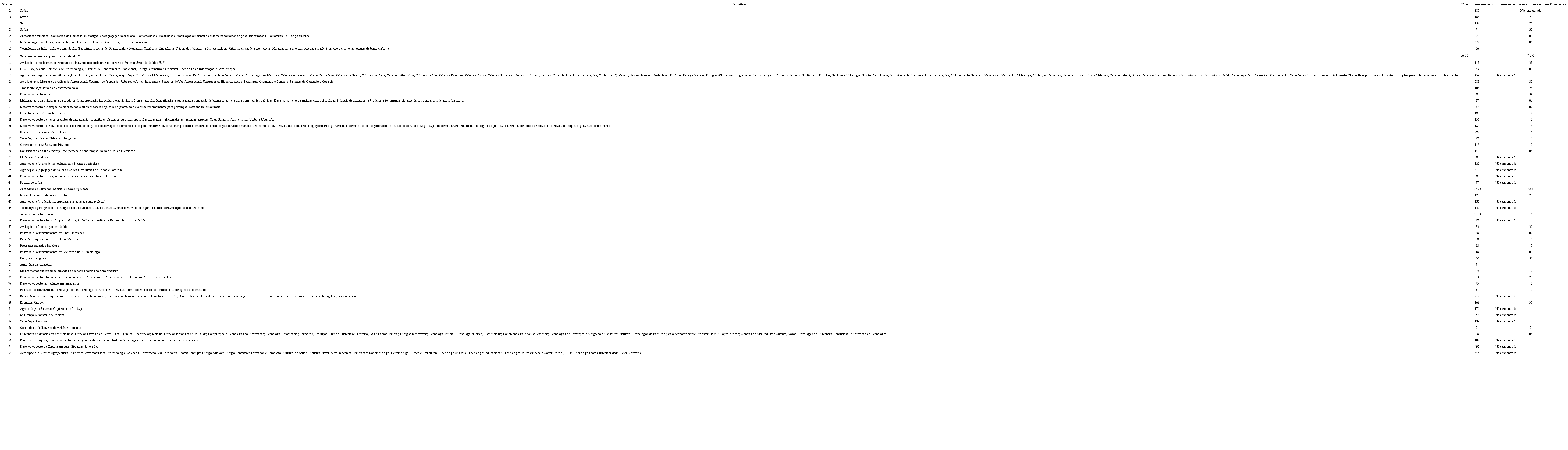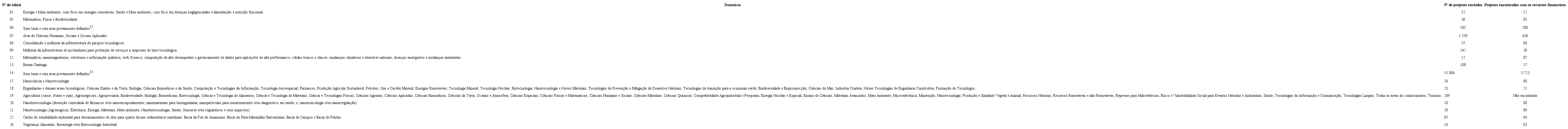 Dos 130 editais estudados, 121 (93,1%) definiram os temas a serem estudados; 04 (3,1%) definiram a área a ser pesquisada e apenas 05 (3,8%) não definiram temas e áreas para as pesquisas. Os temas e áreas indicados estão listados nos quadros abaixo: