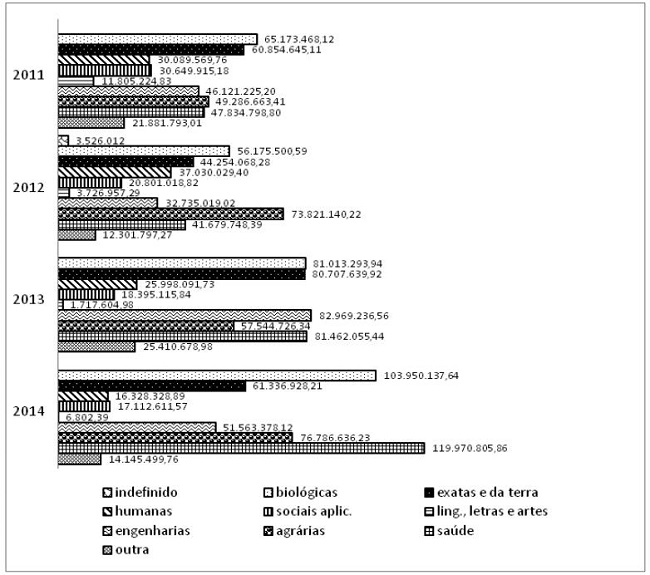 Dos recursos repassados pelo CNPq referentes aos editais de 2011 observa-se que as ciências biológicas seguidas das ciências exatas e da terra receberam a maior parte dos recursos, R$ 65.173.468,12 e R$ 60.854.645,11 respectivamente. No ano de 2012 a grande área mais contemplada foi a ciências agrárias com o repasse de R$ 73.821.140,22. Em 2013 foram às engenharias (R$ 82.969.236,56), ciências da saúde (R$ 81.462.055,44) e ciências biológicas (R$ 81.013.293,94). Em 2014 as ciências da saúde (R$ 119.970.805,86) e biológicas (R$ 103.950.137,64) (Gráfico 1) (BRASIL, 2015). Observa-se que os menores investimentos em todos os anos pesquisados foram para a grande área de linguística, letras e artes; ciências humanas e ciências sociais aplicadas, corroborando com o debate realizado ao longo deste trabalho sobre a indução de pesquisas em outras áreas.