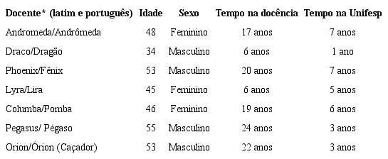 A caracterização dos docentes é apresentada no Quadro 1. Foram atribuídos nomes fictícios ao grupo entrevistado com o objetivo de preservar suas identidades.