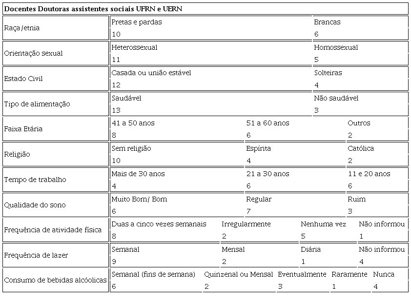 A pesquisa de campo foi realizada no período de abril a junho de 2019, contando com a participação de 16 professoras (sete docentes da UFRN e nove da UERN). Ressalte-se que na UFRN 19 docentes participavam desse programa, sendo 15 na condição de permanente. Entre esses(as), nove assistentes sociais. Por sua vez, o Programa de Pós-Graduação em Serviço Social e Direitos Sociais (PPGSSDS) da UERN é constituído por 14 docentes, sendo 11 assistentes sociais pertencentes ao quadro permanente.