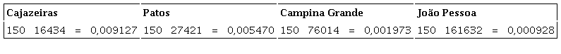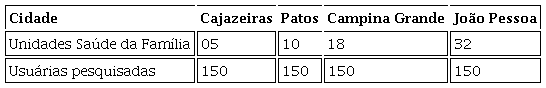 Além disso, considerando que eram atendidas mensalmente nas USF uma média de 16.434 famílias em Cajazeiras, 27.421 em Patos, 76.014 em Campina Grande e 161.632 em João Pessoa2 e supondo que cada família era composta por pelo menos 1 (uma) mulher, foi estabelecida uma amostra de 150 mulheres para cada cidade. Para saber se as amostras provinham de uma população infinita, utilizamos a fração amostral (n = 150 e N= número de famílias atendidas pelas USF nos municípios) e, assim, obtivemos o erro amostral. Dessa forma, a partir da Tabela 1, foi possível constatar que cada fração amostral não ultrapassou 0,05, referendando a pesquisa, já que a população de cada cidade foi infinita.