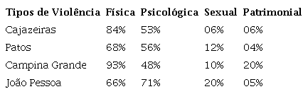 As violências sofridas pelas usuárias das USF foram majoritariamente perpetradas pelos parceiros e ex-parceiros, contabilizando os seguintes percentuais: Cajazeiras, 91%; Patos, 76%; Campina Grande, 83%; e João Pessoa, 94%. As violências praticadas envolveram, com maior frequência, a física e a psicológica, conforme demonstrado na Tabela 3.