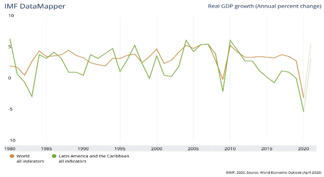 A situação da economia latino-americana (América do Sul, América Central e Caribe) é ainda mais grave. A linha verde do gráfico anteriormente exposto, mostra que nesta parte do continente americano os baixos índices de crescimento conviveram com instabilidades que se acentuaram nos últimos 40 anos. Os momentos de crescimento abrupto do Produto Interno Bruto (quase sempre marcado por índices modestos – ainda que acima da média mundial em momentos pontuais) são rapidamente substituídos por quedas mais fortes, ambos prioritariamente associados aos preços internacionais dos commodities9. Entre 1980 e 1983 houve uma abrupta caída do PIB de 6,5% para -2,8%, uma retomada a partir de 1984 de 3,9%, ligeira estabilidade até 1986 e outra queda intensa até 1990 (atingindo o patamar de 0,6%). Esta instabilidade persistiu ao longo dos anos 1990, apresentando números que oscilaram entre 5,4% (melhor índice, 1997) a 0,1 (pior patamar, 1999). A oscilação, para cima e para baixo, persistiu até 2002, com rápido crescimento até 2004, ligeira estabilidade até 2007 e forte baixa com a crise mundial de 2008 atingindo o índice de -2%. A recuperação em 2009 não se sustentou e entrou em queda livre até 2016, com ligeira recuperação em 2017 (1,3%) e abrupta caída agravada pela pandemia COVID 19 em 2020 (com previsão de -6%) (REAL GDP growth, [2020]). Necessário ressaltar que estes números médios referentes à América Latina logicamente oscilam entre os países do bloco, ainda que no geral a curva de ascensão e de queda siga o padrão internacional: mais modestos nos momentos de crescimento mundial (quando acima da média mundial) e mais radicais nos momentos de depressão (abaixo da linha média mundial). É preciso destacar que tais números representam projeções realizadas na primeira metade de 2020. Dados atualizados, oficialmente divulgados pelo Instituto Brasileiro de Geografia e Estatística (IBGE) em agosto de 2020, indicam que o PIB brasileiro do segundo trimestre teve uma queda de 9,7% comparado com o mesmo período em 2019 (0,1 positivo – o que revela a gravidade de um cenário já em curso antes da pandemia). Informações revisadas sobre o primeiro semestre de 2020, apontam uma queda ainda maior do que havia sido projetado: -2,5% comparado com o mesmo período de 2019.