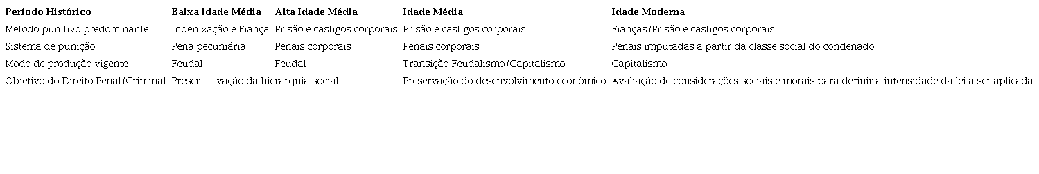 A fim de elucidar o desenvolvimento e formatação do sistema e método punitivo instituído nos diferentes momentos históricos, sociais e econômicos, compartilhamos o Quadro 1, em que sistematizamos as principais características de cada período, considerando que em outros momentos tais modelos de Estado e métodos punitivos já foram abordados.