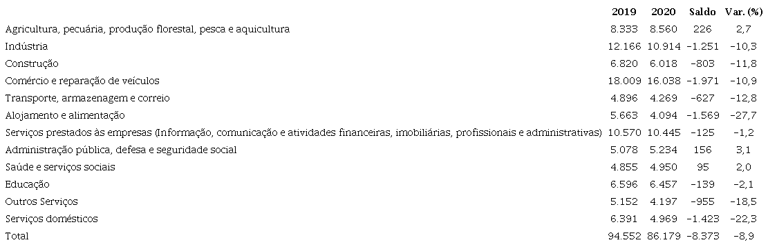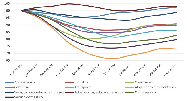 Do ponto de vista da ocupação, as atividades econômicas mais prejudicadas foram os serviços prestados às famílias, que dificilmente puderam ser realizados à distância. As maiores quedas anuais ocorreram no segmento de alojamento e alimentação, bem como nos serviços domésticos e pessoais. Além disso, também foram registradas fortes quedas no comércio, na indústria e na construção. As principais exceções ficaram por conta da agropecuária e do setor público.