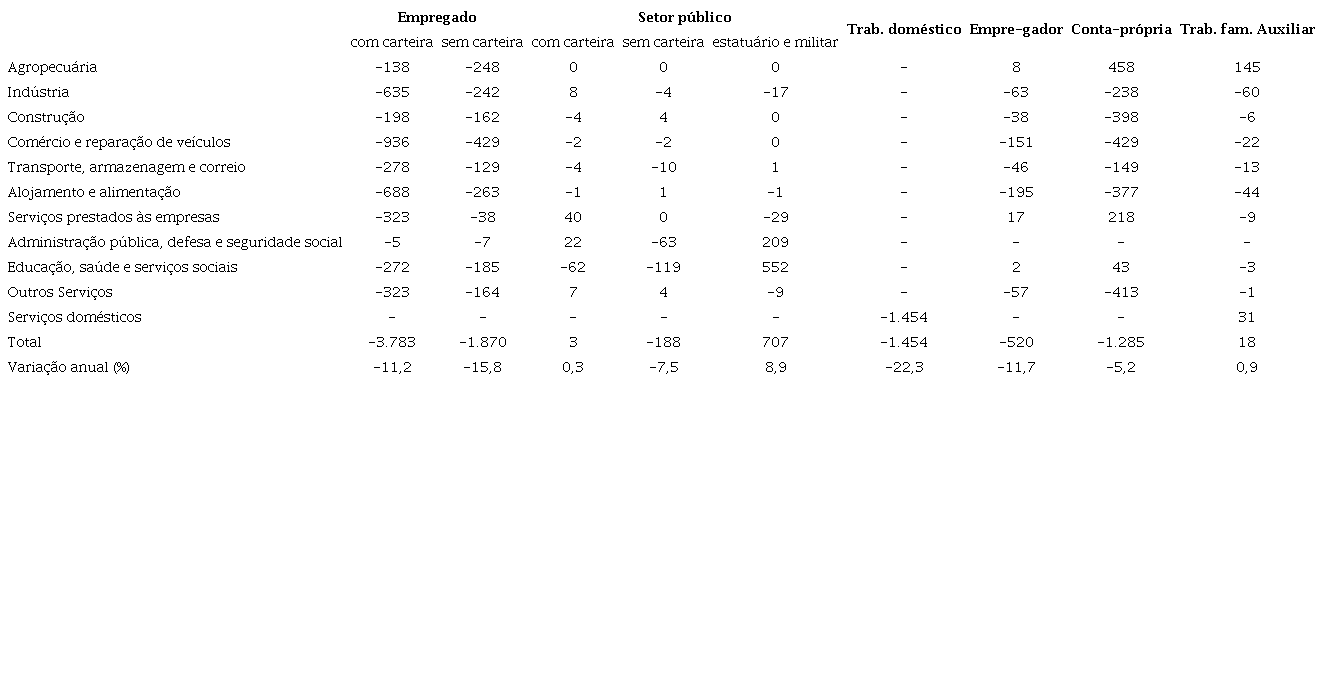 Essa dinâmica setorial está diretamente relacionada às mudanças nas posições ocupadas no mercado de trabalho por cada grupo de trabalhadores, conforme demonstra a Tabela 2. Excetuada a retração no trabalho doméstico, a maior queda relativa ocorreu na categoria dos empregados no setor privado sem carteira de trabalho assinada, cujos postos de trabalho encolheram em 15,8%, significando a perda de 1,9 milhão de empregos. Essa perda foi registrada em todos os setores, todavia foi mais intensa nos serviços de alimentação, no comércio e nos transportes. Além disso, vale destacar a expressiva perda de empregos informais ocorrida nas pequenas indústrias, particularmente na produção artesanal de alimentos e nas facções têxteis e calçadista.