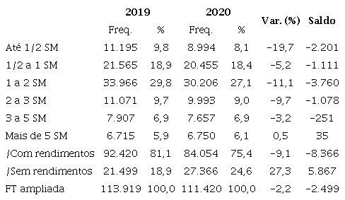 Devido ao fechamento de um grande número de micro e pequenas empresas, a população ocupada como empregador recuou 11,7% em 2020. A característica mais marcante dessa retração é que ela se concentrou entre os donos de pequenos estabelecimentos comerciais e de serviços como alimentação e transportes. Com efeito, os mais prejudicados foram os empregadores informais (sem CNPJ), para os quais a queda chegou a 18,6%.