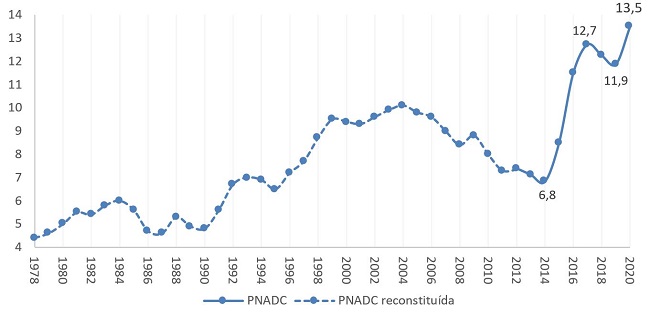 Às vésperas da pandemia, o mercado de trabalho brasileiro ainda se encontrava em grande medida condicionado pelos efeitos da crise econômica deflagrada em 2014. A taxa de desocupação, que era de 6,8% naquele ano, atingiu 12,7% em 2017, mantendo-se em torno dos 12% até 2019. Conforme demonstra a Figura 1, esse patamar não era apenas o maior da série histórica da PNAD Contínua (iniciada em 2012) até então, mas também superava qualquer taxa de desemprego já registrada desde o final da década de 1970.