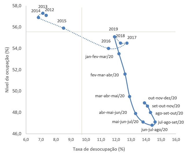 Os primeiros impactos da crise associada à Covid-19, observados no mercado de trabalho a partir de março de 2020, deram início a um período de abrupta queda nas ocupações em todo o país. Com isso, o nível da ocupação (proporção das pessoas de 14 ou mais anos de idade que se encontram ocupadas) caiu dos 55,1% em que se encontrava ao final de 2019, para 46,8% no trimestre compreendido entre junho e agosto de 2020. Isso significa que, pela primeira vez na série histórica, mais da metade das pessoas em idade ativa não estava trabalhando sequer uma hora por semana.