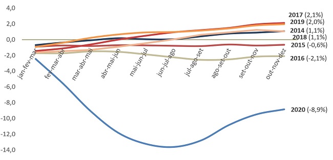 Dentre os demais setores que encerraram o ano no vermelho, consta ainda o de educação, cuja queda de 2,1% se deve basicamente à paralização de instituições de ensino privadas e ao encerramento dos contratos temporários; e os serviços prestados às empresas (informação, comunicação e atividades financeiras, imobiliárias, profissionais e administrativas). Nesse último grupamento, nota-se uma queda menor (-1,2%), relacionada à maior facilidade de migração dessas atividades para o regime de trabalho remoto (MACIENTE, 2020).