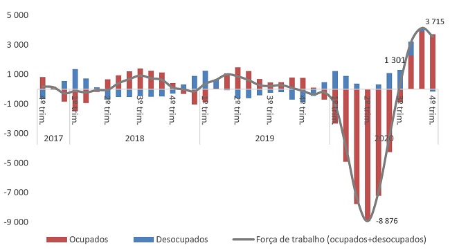 Com isso, o ritmo de crescimento da população fora da força de trabalho voltou ao ritmo pré-pandemia, dando início à fase de conversão das ocupações perdidas em desemprego. A população desocupada, que era de 12,8 milhões de pessoas no trimestre anterior, saltou para aproximadamente 14 milhões no 3º trimestre, crescendo 9,7%. Foi só no 4º trimestre que de fato o mercado de trabalho esboçou alguma recuperação, mediante a retomada de parte da população ocupada (3,7 milhões) e uma queda marginal no desemprego (-167 mil).