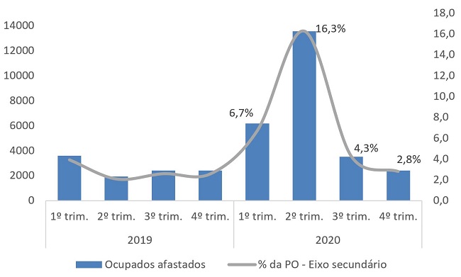 No auge da crise, 13,5 milhões de brasileiros estavam tecnicamente ocupados, mas afastados de seus trabalhos, sendo apenas 3 milhões deles por motivos não relacionados à pandemia. Embora também tenha impactos negativos sobre os rendimentos dos empregados formais, esse processo prejudicou sobretudo os trabalhadores informais, para os quais o afastamento pode ter significado a ausência de renda.