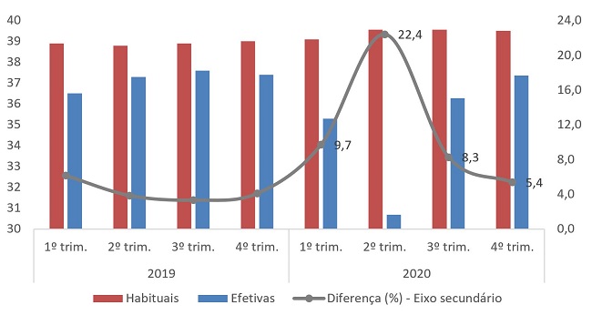 Além disso, outro fator que ocultou a dimensão do desemprego gerado em meio à pandemia foram os afastamentos de trabalhadores e a redução nas jornadas de trabalho. No auge da crise, cerca de 9 milhões de brasileiros estavam tecnicamente ocupados, mas afastados de seus trabalhos por motivos relacionados à pandemia. Muito em função disso, o número de horas médio efetivamente trabalhado situou-se até 22% abaixo das jornadas habituais.