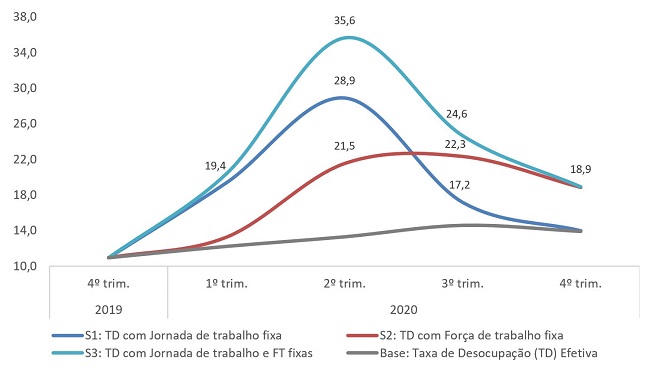 Para descontar os efeitos desses fatores sobre o desemprego, foram feitas estimativas com base em um cenário no qual tanto o número de horas efetivamente trabalhadas, quanto o nível de participação na força de trabalho tivessem se mantido fixos. A partir dessa projeção, concluiu-se que o nível de desemprego potencial oculto pela pandemia pode ter atingido até 35,6% no 2º trimestre de 2020, permanecendo ainda em 18,9% ao final do ano, ou seja, 5 p.p. acima da taxa de desocupação oficial.