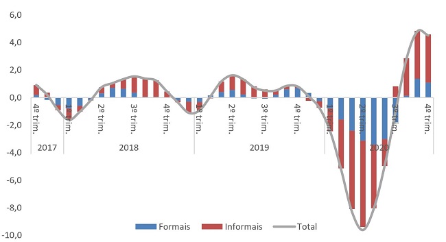 Com a retomada do autoemprego como uma típica estratégia de sobrevivência a partir do 3º trimestre, as ocupações informais assumem uma trajetória mais acelerada de crescimento, ao passo que a recuperação do emprego formal segue um ritmo bastante lento. Isso indica que a “retomada” do mercado de trabalho tem se dado a partir de postos de trabalho majoritariamente precários, via de regra associados a baixas remunerações e alta instabilidade ocupacional. A julgar pelo cenário econômico nacional, a tendência é que esse processo prossiga pelos próximos períodos, elevando ainda mais a informalidade do mercado de trabalho brasileiro, que já vinha em franca ascensão desde 2015.