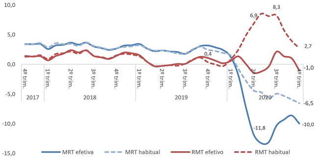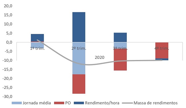 Essa dinâmica atípica dos indicadores de renda se deve às grandes flutuações do nível de emprego e das jornadas de trabalho observadas ao longo de 2020. Para captar a influência desses elementos sobre a MRT, podemos decompô-la da seguinte forma: , sendo o primeiro termo a população ocupada; o segundo a média de horas efetivamente trabalhadas; e o terceiro o rendimento médio recebido por hora efetivamente trabalhada. A contribuição de cada um desses elementos para a variação anual da MRT17 em 2020 é apresentada na Figura 11.