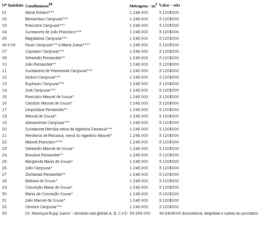Após o requerido pelo advogado, alguns condôminos entraram com pedidos ao juiz questionando o fato de que o mesmo resolveu que seria separado tal pagamento em uma só área de terras “e para isso escolheu a melhor parte do imóvel, dando-se ainda que desse modo virá compreender as moradas, cultivados e benfeitorias dos suplicantes, já no seu quinhão e já nos quinhões de outros condôminos”13 (ARQUIVO HISTÓRICO MUNICIPAL WALDEMAR RUPP apud TAFFAREL, 2019, p. 149). Os descendentes dos legatários solicitaram que o juiz determinasse que cada quinhão fosse formado com as terras contíguas as suas respectivas moradas, benfeitorias e cultivados.