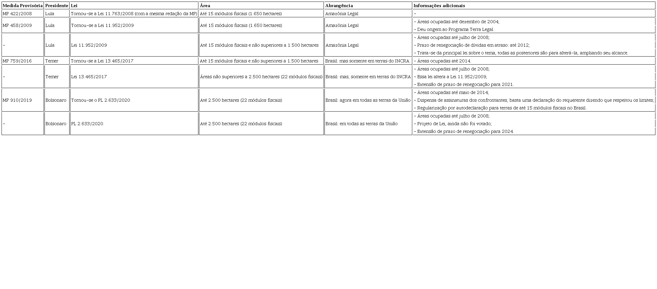A análise das medidas adotadas pelo Estado demonstra que, ao longo do tempo, o acesso à terra por meio da regularização fundiária tem sido uma preocupação constante no Brasil. Governos diferentes, do ponto de vista partidário e político-ideológico, têm adotado medidas de impacto territorial semelhante. Em 2008, o ex-presidente Lula publicou a MP 442, possibilitando a regularização da grilagem de terra na Amazônia; em 2019, o atual presidente Bolsonaro publica medida parecida, a MP 910, ampliando a grilagem.