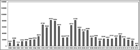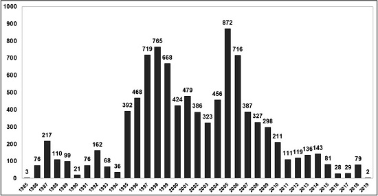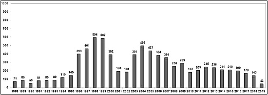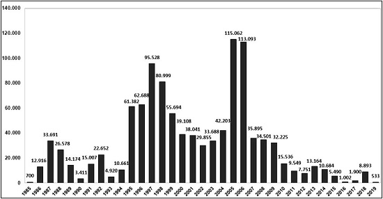 Os números referentes às ocupações de terra no Brasil caíram significativamente nos últimos anos, chegando em 2019ao menor patamar desde a Constituição Federal de 1988. No Gráfico 1 são apresentados os números de ocupações por ano e permite a apreensão dessa variação.