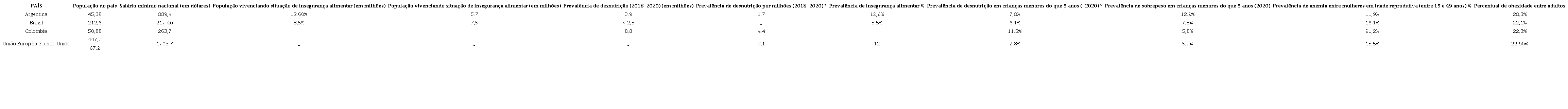 La obesidad ha crecido una media del 4,4% en todo el mundo en la última década. Sin embargo, en Europa este porcentaje fue aún mayor, pasando del 17,2% (2000) al 23,3% (2016), denotando una clara substitución o subordinación de la producción agrícola del producto in natura, por el abastecimiento de la industria alimentaria. (FAO/ONU, 2021). Vea a seguir Tabela 1 sobre Indicadores de Seguridad e Inseguridad