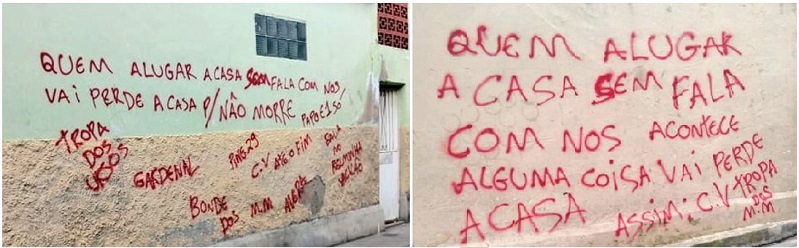 Nas Figuras 1 e 2 tem-se dizeres que nada mais são que propósitos comunicativos, que mostram que a facção desse território em questão (Complexo da Penha, na Zona Norte do Rio de Janeiro), não permite que os(as) moradores(as) aluguem as suas casas sem comunicar a facção, com o risco de perderem as suas residências caso não seguirem essas ordens. A prática da pichação, nesses casos, longe de estar ligada àquela ideia de uma ação “idealizada”, de ser tão somente uma expressão livre e/ou de natureza crítica, tal como longe de estar relacionada ao interesse social-coletivo de ser forma de resistência e questionamento do sistema social e/ou político, reflete a função de ser instrumento de normatização dos comportamentos.
