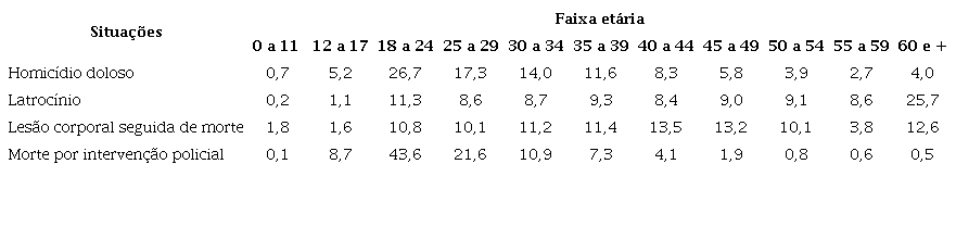 O Quadro 1 mostra que a polícia é responsável pela morte de grande contingente de pessoas, sobretudo, de jovens de 18 a 24 anos (43,5) e de 25 a 29 anos (21,6). A maioria das vítimas é constituída por pessoas jovens, pobres e negras, moradoras das periferias urbanas. Considerando os dados do ano de 2019 no Brasil, 66% do total das mulheres assassinadas eram negras, sendo que em “termos relativos, enquanto a taxa de homicídios de mulheres não negras foi de 2,5, a mesma taxa para as mulheres negras foi de 4,1” (CERQUEIRA, 2021, p. 38).
