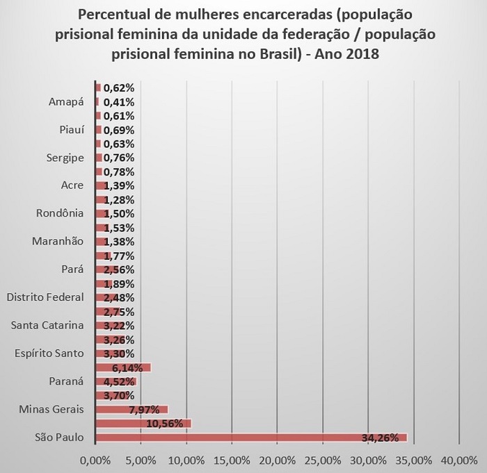 O Gráfico 2 mostra que os estados com maior número de mulheres encarceradas são os seguintes: São Paulo (34,26%), Rio de Janeiro (10,56%) e Minas Gerais (7,79%), seguidos dos estados de Mato Grosso do Sul (6,14%) e Paraná (4,52%).