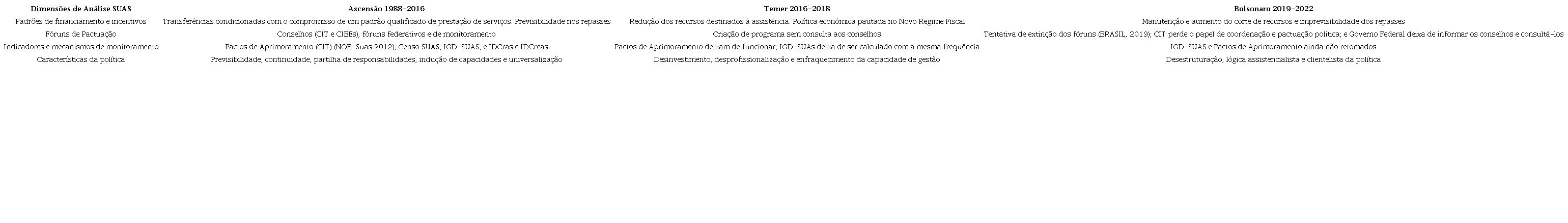 Acerca da análise histórico-institucional, o primeiro período analisado remete ao contexto pós-promulgação da Constituição Federal de 1988 até o momento da criação do SUAS, em 2005, período de fortalecimento de uma agenda de mudanças nas relações intergovernamentais. Ela fomentava a descentralização da política sob uma forte coordenação federativa, propiciando a criação de sistemas de políticas públicas. O segundo momento é a análise do governo Temer, que, a partir da análise das legislações e dos dados governamentais, mostra-se como um momento de ruptura de uma gestão que estimulava a ascensão do SUAS e inicia um processo de desestruturação a partir do desinvestimento. O último momento é o do governo Bolsonaro, que, sob um slogan “Mais Brasil e Menos Brasília”, leva à desestruturação do SUAS, tomando como pontos de partida a desconstrução dos princípios legais do Sistema e a reorganização ministerial do antigo MDS. Por fim, empreende-se um esforço no sentido de debater teórica e comparativamente o percurso da política nos três períodos analisados.