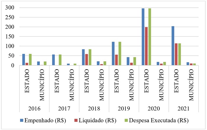 Ao se depararem com uma crise política e institucional interna, lideranças estaduais e municipais passam a buscar novos contornos e caminhos nas relações interfederativas brasileiras, a despeito da desresponsabilização do Governo Federal. Com a ausência da União na articulação junto aos municípios, os governos estaduais passaram a investir mais em programas próprios. Isso já se tem verificado na ampliação dos programas de auxílio com o investimento de mais de 5 bilhões em 22 estados (WATANABE; OTTA, 2021). Diferentemente da União os estados aumentaram suas despesas na pasta da Assistência Social nos últimos anos, como mostra o Gráfico 1.