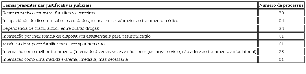 Foi identificado que 39 justificativas, 72% dos processos, projetam o modelo biomédico atrelado ao discurso jurídico-punitivo, ao colocar os sujeitos usuários na condição de uso abusivo de substâncias psicoativas. Musse (2018) define o paradigma jurídico-punitivo como aquele que legitima as internações forçadas, por considerar as pessoas que fazem o uso abusivo e/ou com alto grau de dependência de drogas são um risco social por ameaçarem suas vidas e a de terceiros, o que justifica a privação da liberdade desses sujeitos. A conduta desses usuários considerados desviantes e criminosos não pode ser tolerada no convívio social, o que justifica a segregação. Com a atuação do judiciário, recupera-se a disputa materializada com o uso da força punitiva do Estado, os mecanismos de controle justificados pelo combate às drogas são próprios do Estado neoliberal de cunho penal (ROCHA; LIMA; FERRUGEM, 2021).