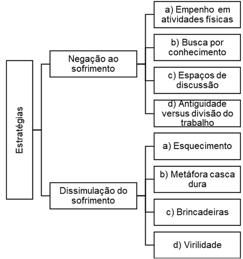 Os dados produzidos foram analisados mediante análise de conteúdo. Essa forma de análise, compreende conjunto de técnicas que visa analisar as comunicações, através da sistematização de procedimentos objetivos permitindo a inferência de conhecimentos relativos às mensagens (BARDIN, 2020). No processo de análise, a partir do referencial da Psicodinâmica do Trabalho, foram compreendidas estratégias de defesa como de negação ao sofrimento, e outras que dissimulação o sofrimento, conforme apresentado a seguir (Figura 1), compreendidas na próxima seção.