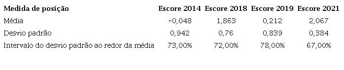 De acordo com os dados da Tabela 2, a dispersão dos escores ao redor da média para cada ano analisado é inferior a 1 (um) desvio padrão, em outras palavras, 73% dos escores de 2014, 72% dos escores de 2018, 78% dos escores de 2019 e 67% dos escores de 2021 estão situados próximos ao valor médio, indicando baixa dispersão dos escores em cada ano. Desse modo, a média aritmética dos escores dos quatro anos de cada município foi tomada como variável independente.