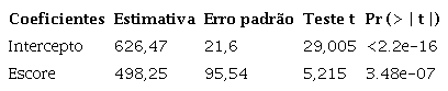 O intercepto, cujo valor aproximado é de 630, indica que municípios com escore igual a zero têm probabilidade de ter um resultado de 630 BOs de VDFcM a cada 100 mil habitantes no modelo ajustado por meio de logaritmo da variável independente.