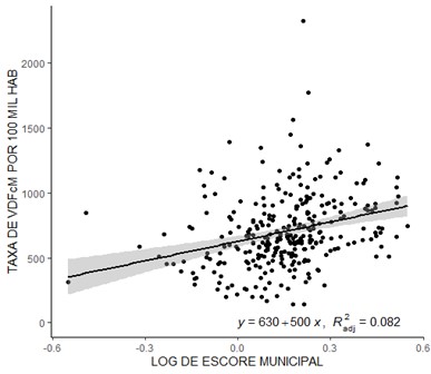 De acordo com a regressão aplicada, existe uma correlação estatística positiva entre os municípios que possuem maior escore e a taxa de VDFcM por 100 mil habitantes. O resultado da regressão segue destacado na Tabela 3.