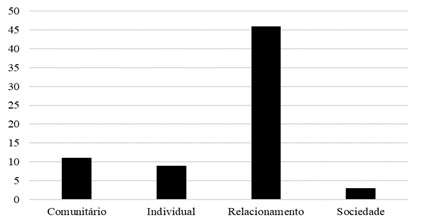 Diante do exposto, constata-se predominância de PPs no nível de relacionamento, tais como suporte à resolução de conflitos familiares, como, por exemplo, assistência à vítima, medidas protetivas de distância do agressor e abrigo institucional. No nível comunitário, tem-se, por exemplo, a existência de organismo executivo de políticas para as mulheres, programas de direitos humanos para mulheres e comissão para implantação e acompanhamento de crianças e adolescentes para convivência familiar. No nível individual, foram observadas PPs de assistência à saúde, porém, após a ocorrência da VDFcM, tais como comitê para enfrentamento à violência física e sexual, serviço de atendimento de emergência. No nível sociocultural, apenas três PPs foram observadas, capacitação em gênero no setor público, articulação municipal para incorporar questões de gênero nas PPs e execução de políticas para promoção e igualdade de gênero.