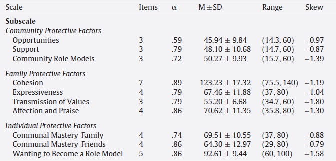 This scale was adapted from the Protective Factors scale for Yup'ik adults (Allen et al., 2006), itself derived from qualitative life history exploring important protective factors. Three subscales tap opportunities (e.g., There were things to do for fun other than drinking), support (e.g., People supported and helped me if I needed it), and community role models (e.g., I have someone in the community who I can look up to).