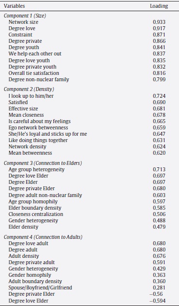 Table 2 presents loadings for the top ten loading variables on the first four components in the PCA of network variables. Examination of the screen plot of the eigenvalues found support for retaining four principal components, accounting for 67.1% of the variance. The first component, size, composed of variables including network size, degree love, constraint, and degree private accounted for 28.3% of variance. The Density component was composed of variables including I look up to him/her, satisfied, effective size, mean closeness, ego network betweenness, network density, and efficiency for 19.3% of variance. The third component, Connection to Elders, was composed of variables including age group heterogeneity, degree of love elder, elder, private elder, and adult non-nuclear family, accounting for 11.5% of variance. The fourth component, Connection to Adults, included variables such as degree of love adult, adult, private adult, and adult density, and accounted for 7.9% of variance.