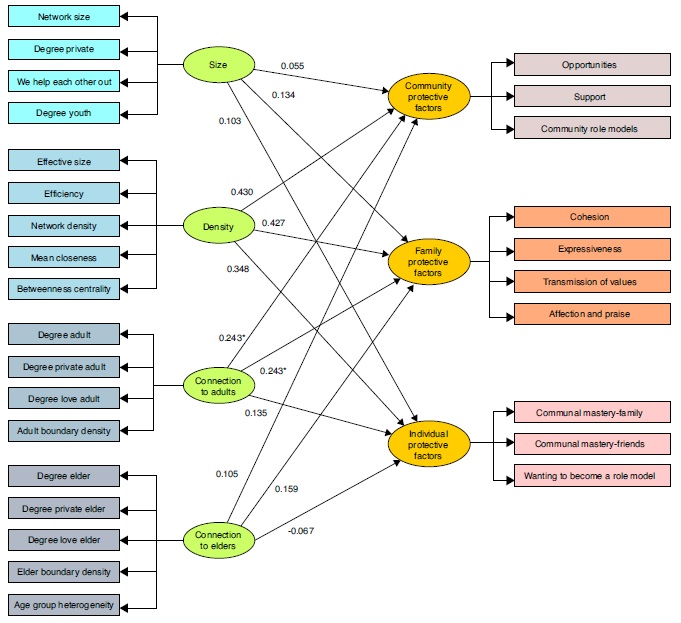 Table 3 displays weights, loadings, communalities and fitting characteristics for the final network variables selected for Size, Density, Connection to Adults, and Connection to Elders from the PCA, and for subscales composing the Community, Family and Individual Protective Factors in the outer model. In PLS-PM, latent variable scores are weighted sums of their manifest variables, and weights represent the relative contribution of each manifest variable to the latent variable. For the latent variable Size, weight for degree youth was much higher than for all other variables, while in the latent variables Density and Connection to Adults the weights for all variables were quite similar, and for Connection to Elders, age group heterogeneity had a higher weight than all other variables. For Community and Family Protective Factors, subscale weightings were generally at similarly levels, but for Individual Protective Factors, the Wanting to Become a Role Model subscale had a weight twice the magnitude of the other subscales. Communalities are squared loadings representing the proportion of the variance in a manifest variable captured by its latent variable. Sanchez (2013) recommends loadings >.7 and communalities >.5. Unidimensionality is tested through Cronbach's alpha, Dillon-Goldstein's rho, and the first and second eigenvalues; alpha and rho exceed .80 in all cases, and often approach or exceed .90, while first eigenvector >1, and second eigenvector <1. Additionally, cross-loadings, calculated, but not presented in the table, showed that each manifest variable always loaded higher for its theorized latent variable that for the others.