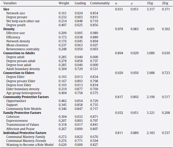 Note. Top ten loading variables on first four components; all loadings p < .001.Fig. 1 presents the PLS-PM analysis inner or structural, and outer or measurement models. The inner model describes the relationship of the four network latent variables identified in the PCA, labeled Size, Density, Connection to Adults, and Connection to Elders, to each of the three protective factors latent variables, labeled CPF, FPF, and IPF (thick arrows). The outer model links each latent variable to its block of manifest variables (thin arrows). The blocks of protective factors latent variables are composed of the 10 sub-scales described above. The manifest variables composing each network block were guided by the PCA, and were selected from among the highest loading variables on each component to insure both best model fit and maximally coherent interpretation for the block. The variables that did not function well, i.e., with low communality or near zero weight in the outer model, were removed. For example, the variables qualifying the ties (e.g., I look up to him/her) did not function well in the density block for the PLSPM model, and were therefore not used.
