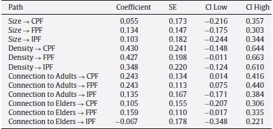 Note. Weight = relative contribution of each manifest variable to the aligned latent variable; Loading = association of each manifest variable and the aligned latent variable; Communality = squared loadings representing proportion of variance in each manifest variable captured by the aligned latent variable; α = Cronbach's alpha; ρ = Dillon-Goldstein's rho; 1Eig = 1st eigenvalue; 2Eig = 2nd eigenvalue. Variables labels in bold are latent variables; variables labels in plain text are manifest variables.Table 4 summarizes the inner or structural model, providing path coefficients and their standard errors, and confidence intervals at the 90% or . < .1 level; a path is considered statistically significant if its CI does not contain 0. The paths coefficients, corresponding to regression slopes, for size to all three Protective Factors are close to zero and non-significant. The paths from Density to all three Protective Factors are all higher, but non-significant, although Density → FPF = 0.43, ns, approaches significance (CI -0.01, 0.66) and this may be due to the wider confidence intervals that are likely related to the extreme right skew of the density construct distribution. Path coefficients for Connection to Adults → CPF = .24, . < .1, and Connection to Adults → FPF = .24, . < .1, were significant, while Connection to Adults → IPF = .14, ns. The path coefficient for Connection to Elders → FPF = .16, ns, approaches significance (CI -0.02, 0.34), while Connection to Elders → CPF = .11, ns, and Connection to Elders → IPF are close to zero. Fig. 1 summarizes path coefficients and their significance. Overall model .. = .31 for CPF and .30 for FPF are high effect sizes, while .14 for IPF is medium, based of the respective values of Cohen .. of .44, .43, and .16 (Cohen, 1992). The overall goodness-of-fit criterion (0 < GoF < 1; Tenenhaus et al., 2005) is calculated as the geometric mean of the average communality and the average .. value, and represents the average predictive power of the model. GoF = .44 exceeds the cut-off value of .36 proposed by Wetzels, Odekerken-Schroder, and Van Oppen (2009) for a large effect size, but also indicates a substantial proportion of protective factors variance is not predicted by the model.