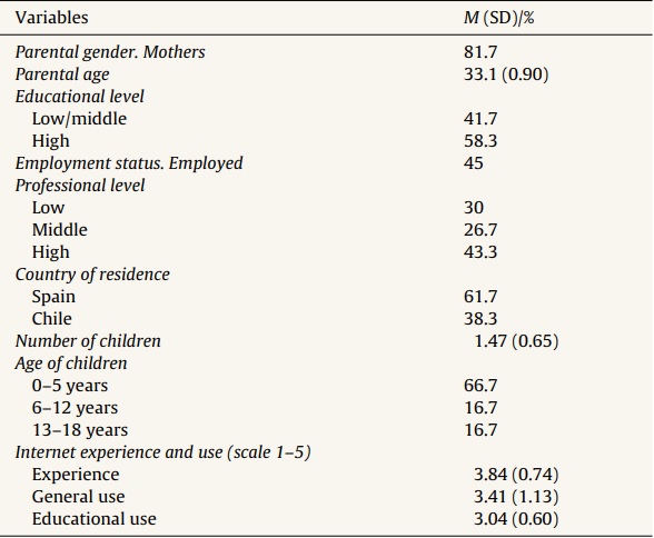 The participants in this study were the first 60 parents to complete one of the program's modules. Of these, 81.7% were women and 18.3% were men, and they were aged from 20 to 56, more than half with high educational level; 66.7% had children under the age of five. Participants were quite experienced in Internet (. 3.84, SD .74) and the general use of the Internet (. 3.41, SD 1.13) was higher than that of educational use of the Internet (. 3.04, SD .60). 60% of the participants were from Spain and 40% were from Chile, reflecting progress currently being made in the latter country in family policy and, in particular, on online parenting support. The remaining characteristics can be found in Table 1.