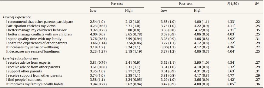 Significant differences in online parenting support found in the pre-test/post-test comparisons were significantly influenced by both the level of experience with the Internet and the educational use of the Internet, with a medium to large ES (Table 2); the impact of the level of use of the Internet for general purposes (Look up directions using an online map, do online banking, etc.) was not significant for online parenting support.