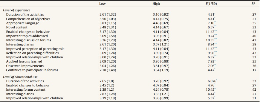 Looking at usability, it was observed that participants with a high level of experience with the Internet are more likely than those in the low experience group to find the duration of the activities to be appropriate, understand the module objectives, and consider the language to be appropriate. With respect to the module content, participants in the high experience group were more likely than those in the low experience group to find the content novel, to agree that it had enabled changes to their behavior, to consider that it addressed important topics, and to find the forums and diaries interesting. With respect to satisfaction with the parenting role, it was found that parents in the high experience group stated that they reflect more on parenting difficulties, perceive improvements in relationships with their children, apply the lessons learned from the program content, observe improvements after applying lessons learned, and continue to participate in forums.