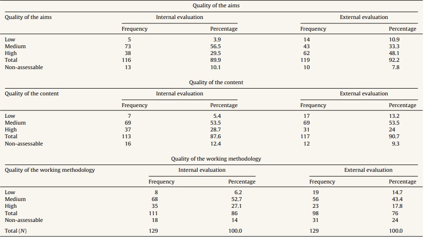 In relation to the assessment of the quality of the aims set, institutional evaluations gave mid-level scores, while the external evaluations (i.e. those carried out by the research team conducting the interviews) awarded more programmes a lower score, and gave those assessed as mid-level by the institutions themselves a lower rating. Nevertheless, the external evaluations awarded high scores to almost 50% of all programmes, and 81.4% were scored as acceptable, while only 10.9% were rated as low. The results regarding the quality of the aims as assessed by the people responsible for the programmes and by the research team (external evaluation) are provided in Table 1.