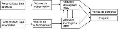 A su vez, autoritarismo y dominancia han resultado ser 2 de los predictores más potentes del prejuicio generalizado (e.g., Ekehammar, Akrami, Gylje y Zakrisson, 2004; McFarland, 2010), al que ya Allport (1954/1979) hizo referencia en su obra clásica. Sin embargo, el concepto de que quienes mantienen un potente prejuicio contra un grupo evalúan negativamente también a otros grupos minoritarios ha sido retado por investigaciones derivadas del modelo de proceso dual de Duckitt (2001), para el que el autoritarismo y la dominancia son dimensiones actitudinales de amplio espectro que median la influencia de la personalidad sobre el prejuicio, siendo la apertura a la experiencia una disposición que en niveles bajos condicionaría una percepción del mundo como un lugar inseguro y peligroso, así como una ideología autoritaria y favorecedora del mantenimiento del orden social y la seguridad, determinando el prejuicio hacia grupos amenazantes. Por su parte, la amabilidad sería el rasgo que en niveles bajos predeciría la percepción del mundo como una jungla competitiva, así como una ideología dominante a favor de la desigualdad que, a su vez, anticiparía el prejuicio hacia grupos devaluados en estatus y poder. Por otra parte, ambas actitudes ideológicas predecirían el prejuicio hacia grupos disidentes, percibidos tanto como una amenaza para los valores sociales y la seguridad, como un reto para el estatus y poder endogrupal. Diversos estudios han aportado evidencia sobre este proceso dual, tanto en diseños transversales (Cantal, Milfont, Wilson y Gouveia, 2015; Duckitt, 2006; Duckitt y Sibley, 2007; Sibley y Duckitt, 2009; Sibley, Hardock, Perry, Asborck y Duckitt, 2010; Ungaretti, Etchezahar y Brussino, 2015; Van Hiel, Cornelis y Roets, 2007) como longitudinales (Asbrock, Sibley y Duckitt, 2010; Kteily, Sidanius y Levin, 2011; Perry y Sibley, 2012; Sibley y Duckitt, 2010, 2013) y experimentales (Duckitt y Sibley, 2010; Perry y Sibley, 2013), de manera también coherente con los metaanálisis realizados en el ámbito de las actitudes ideológicas y el prejuicio (Cohrs y Stelzl, 2010; Perry, Sibley y Duckitt, 2013; Sibley y Duckitt, 2008).