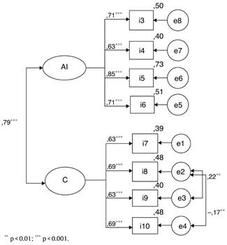 Se estimaron mediante regresión las puntuaciones factoriales, verificándose una correlación ligeramente elevada entre los factores 1 y 3 (r = 0.521, p < 0.001), y otra ligera entre los factores 1 y 2 (r = 0.194, p < 0.001) y entre el 2 y el 3 (r = 0.170, p = 0.004). Por otra parte, solo la fiabilidad de los factores 1 (αAI = 0.82) y 3 (αC = 0.76) se consideró satisfactoria (en el caso del segundo factor, αVC = 0.51). Un análisis factorial confirmatorio verificó este escenario de 2 factores (fig. 2), encontrándose un buen ajuste de la estructura factorial mencionada en los datos (CFI = 0.980; GFI = 0.978; NNFI = 0.967; RMSEA = 0.058; SRMR = 0.031).