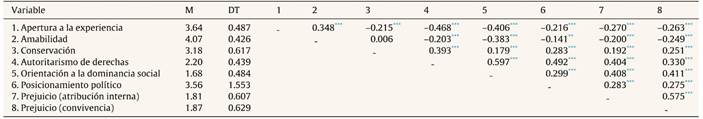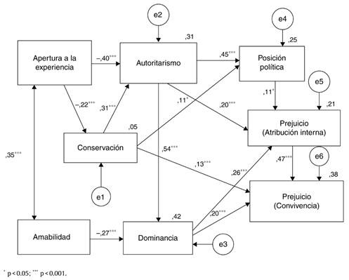 Dos de las variables influyeron solo directamente sobre los 2 tipos de prejuicio (dominancia y posicionamiento político), 2 lo hicieron únicamente a través de vías indirectas (apertura a la experiencia y amabilidad), y otras 2 repartieron sus efectos entre las vías directas y las indirectas (conservación y autoritarismo). Los tamaños de los efectos directos sobre los componentes de prejuicio no fueron elevados, sobresaliendo únicamente el existente entre ellos (es decir, el ejercido por la atribución interna sobre la convivencia, β = 0.471, SE = 0.038, p = 0.012). Por su parte, el efecto de la orientación a la dominancia social sobre la atribución interna alcanzó una intensidad entre moderada y ligera (β = 0.257, SE = 0.050, p = 0.020), mientras que en el caso de la explicación de la atribución interna se hallaron efectos leves del autoritarismo (β = 0.196, SE = 0.054, p = 0.007) y el posicionamiento político (β = 0.110, SE = 0.043, p = 0.012), como también sucedió, en lo que se refiere a la explicación de la convivencia, con los efectos ejercidos por la dominancia (β = 0.195, SE = 0.038, p = 0.008) y la conservación (β = 0.125, SE = 0.034, p = 0.018). En cuanto a otros efectos directos estandarizados, destaca el del autoritarismo sobre la dominancia (β = 0.545, SE = 0.029, p = 0.014) y sobre el posicionamiento político (β = 0.450, SE = 0.038, p = 0.004), así como el de la apertura a la experiencia sobre el autoritarismo (β = -0.402, SE = 0.033, p = 0.007). Globalmente, se confirma el modelo hipotético en la medida en que los rasgos de personalidad inciden sobre las actitudes ideológicas, y estas lo hacen sobre el prejuicio, y también sobre la posición política en el caso del autoritarismo. Adicionalmente, una dimensión de valor (conservación) actuó mediacionalmente entre la personalidad y el autoritarismo, influyendo asimismo de manera directa sobre el prejuicio (convivencia) y la posición política.